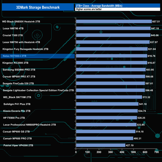 The average bandwidth figure for the 2TB Netac NV7000-t for the complete benchmark run was 616.76MB/s.