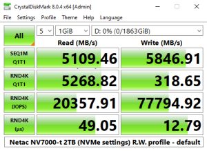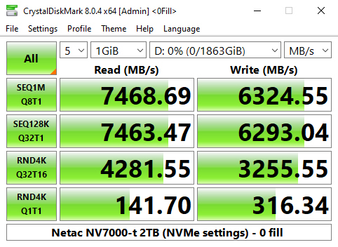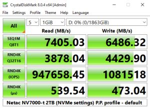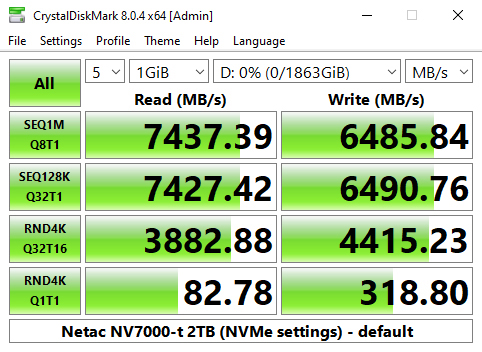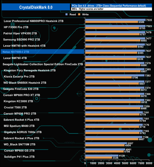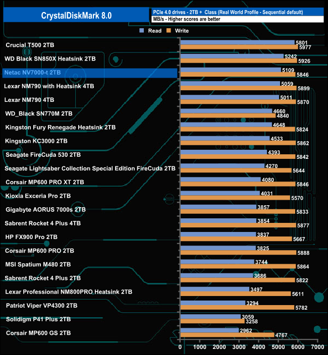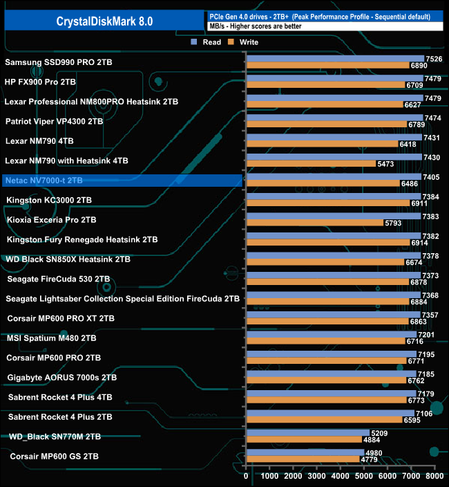 The NV7000-t's Sequential read test result of 7,437MB/s puts the drive into sixth place on our results table.