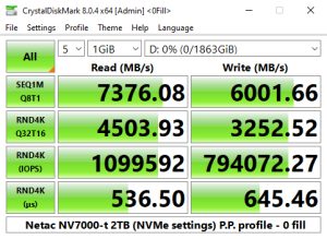 Looking at the benchmark result screens we can confirm the official Sequential read rating of 7,300MB/s and even better it a little with a test result of 7,437MB/s. However, when it came to Sequential writes our test result score of 6.485MB/s is somewhat short of the official maximum of 6,700MB/s. The controller in the drive seems happier dealing with compressible data when it comes to reading 4K data as can be seen by the 0 fill result screen for QD1 T1 and QD32 T16. On the flip side the 4K QD32 T16 write performance dropped when using compressible data.