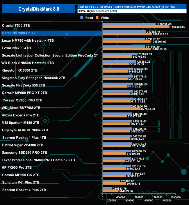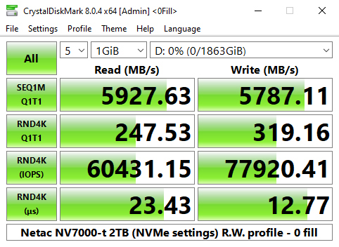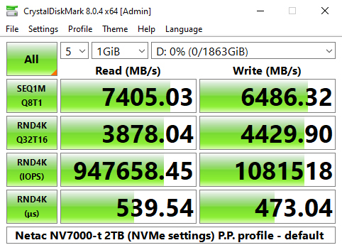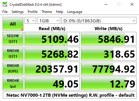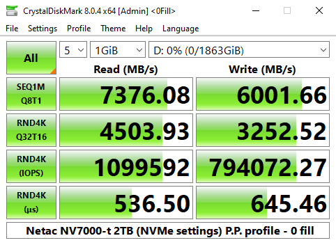 Netac quotes 4K random performance figures for the NV7000-t of up to 900,000 IOS for reads and up to 700,000 IOPs for writes. When tested with the Peak Performance profile test in CrystalDiskMark8 we could confirm those figures and indeed better them. The best read score we saw was 947,658 IOPS while the best write result, 1,081,518 IOPS soared past the official figure.