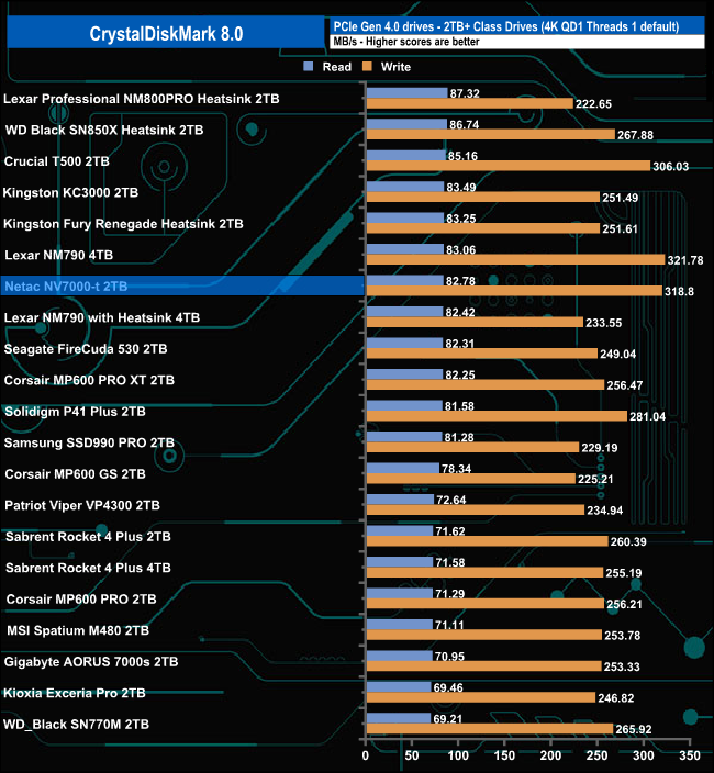 The Netac's NV7000-t read score of 82.78MB/s in CrystalDiskMark 8's 4K QD1 test sees it in the top ten of our results chart. However, its write score of 318.80MB/s is the second fastest we've seen in this test for a Gen 4 drive to date.