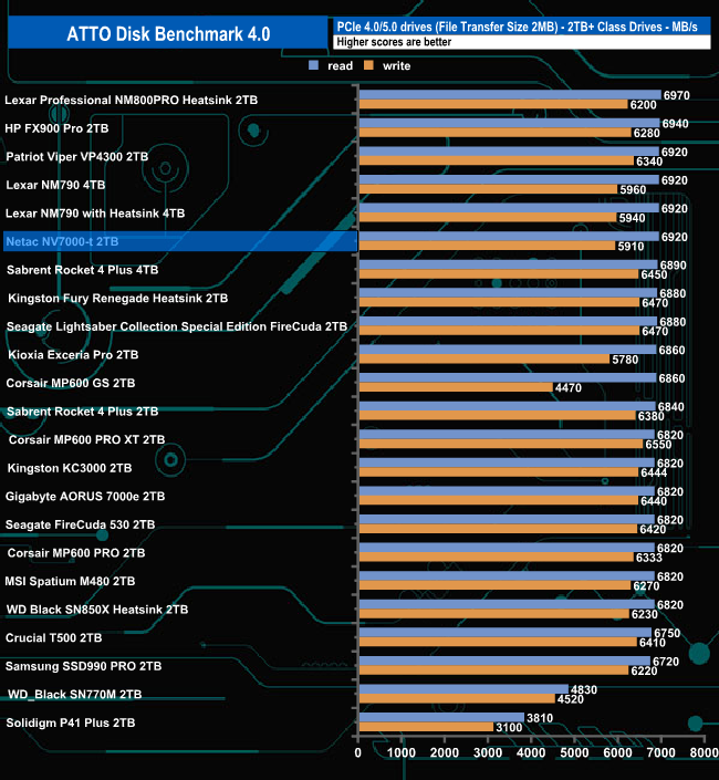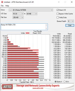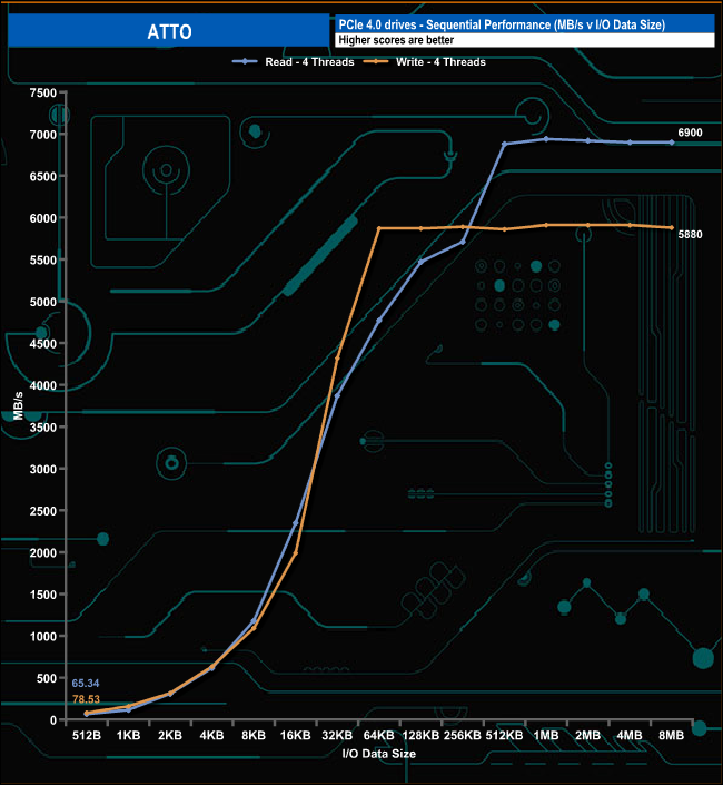 With the ATTO benchmark results the drive fell short of the official 7,300MB/s and 6,700MB/s for reads and writes respectively, with reads at 6,920MB/s and writes at 5,910MB/s.Even so the drive still made it into the top ten on our results chart.