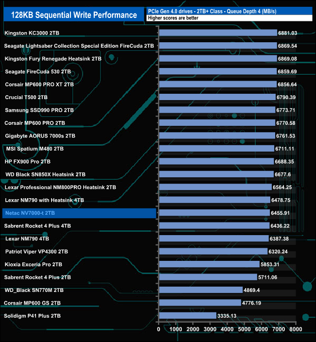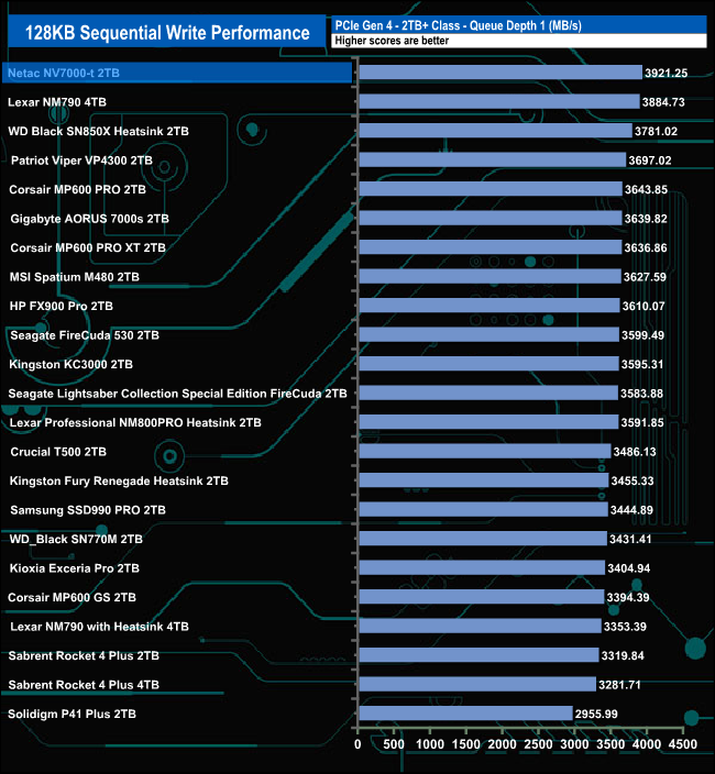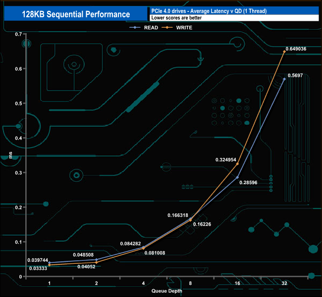 At QD1 the drive is the fastest Gen 4 drive we've seen to date for Sequential writes. However, as the QD increases the drive drops down the results tables.