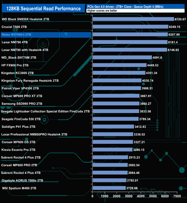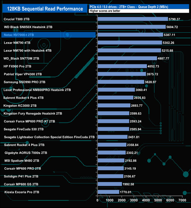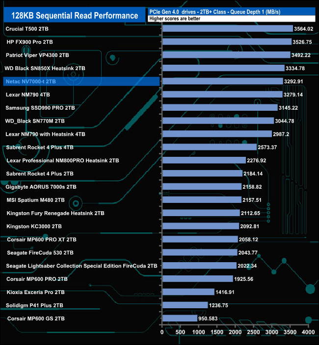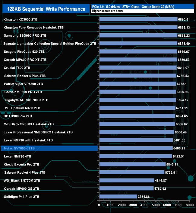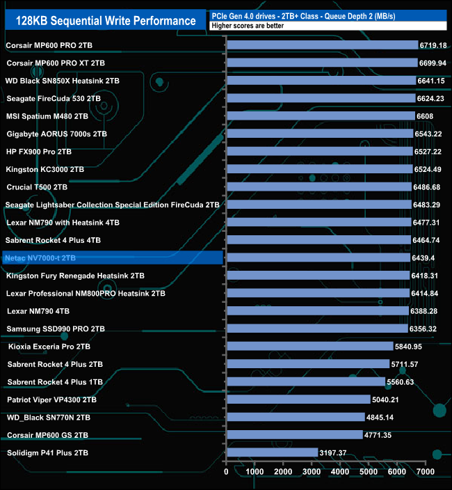 The Netac NV7000-t performs best in relation to drives around it in QDs 2 and 4 where it sits in third place in the result charts. At QD1 it sits in fifth place while at QD32 it slips to outside the top 10.