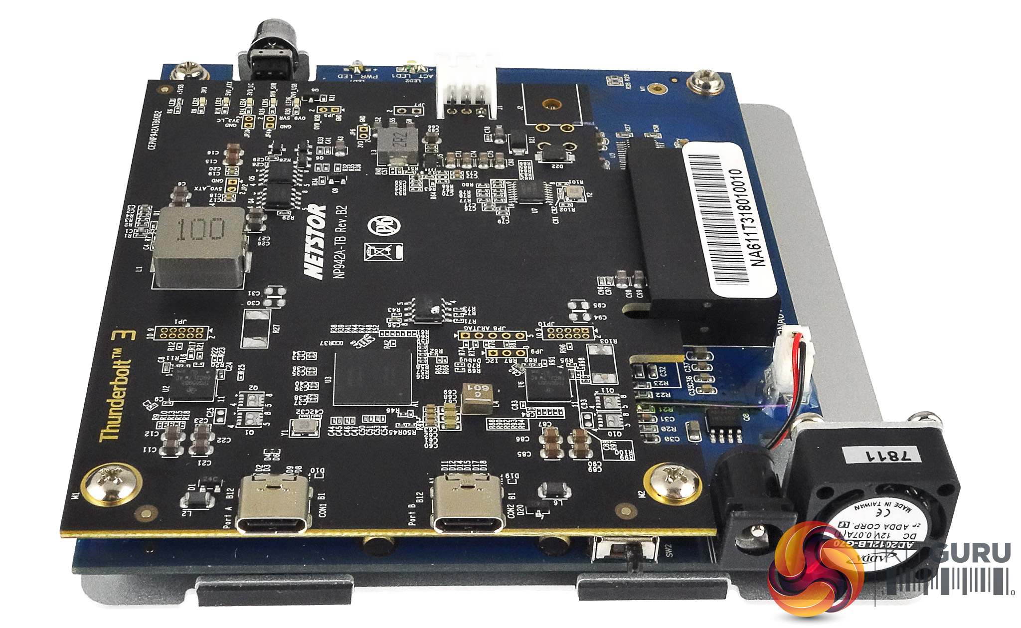 The rear panel has the two Thunderbolt ports, two-way fan switch (more on that in a minute), the power in port and the cover for the fan. The two way fan switch controls a tiny 20mm ADDA AD2012LB-G70 fan. The AD2012LB-G70 has a rated spin speed of 9,000 rpm, shifting 0.5CFM of air.