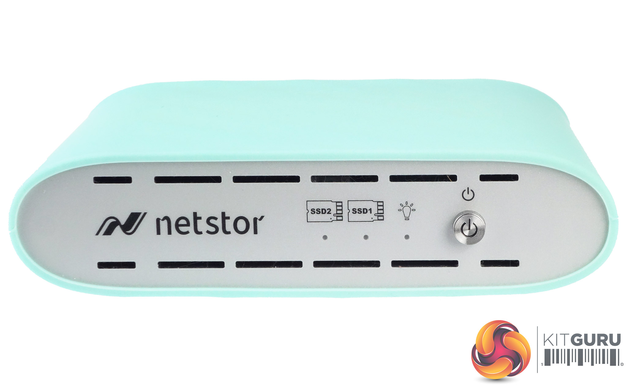 Along with the power button on the front bezel, there is also three indicator LEDs; one for power that glows blue for power on and amber for standby, and then two white drive activity LEDs. Above the two drive activity LEDs are two little M.2 icons, so if there is a problem when you are using two drives, at least you know which one is causing the problem. Above and below these LEDs and across the whole front bezel are rows of cooling vents.