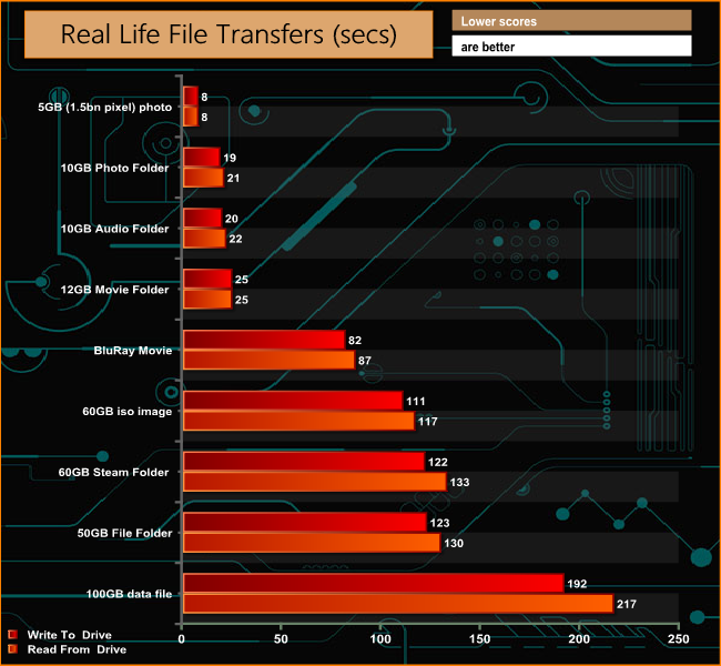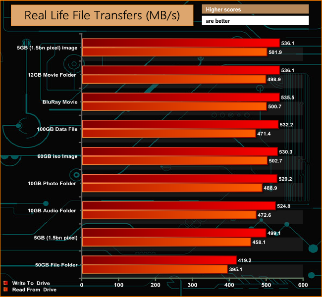 The drives write performance when dealing with our real life file transfer tests is very good, topping 500MB/s for all bar the 50GB File Folder transfer where the write performance drops to just over 400MB/s.