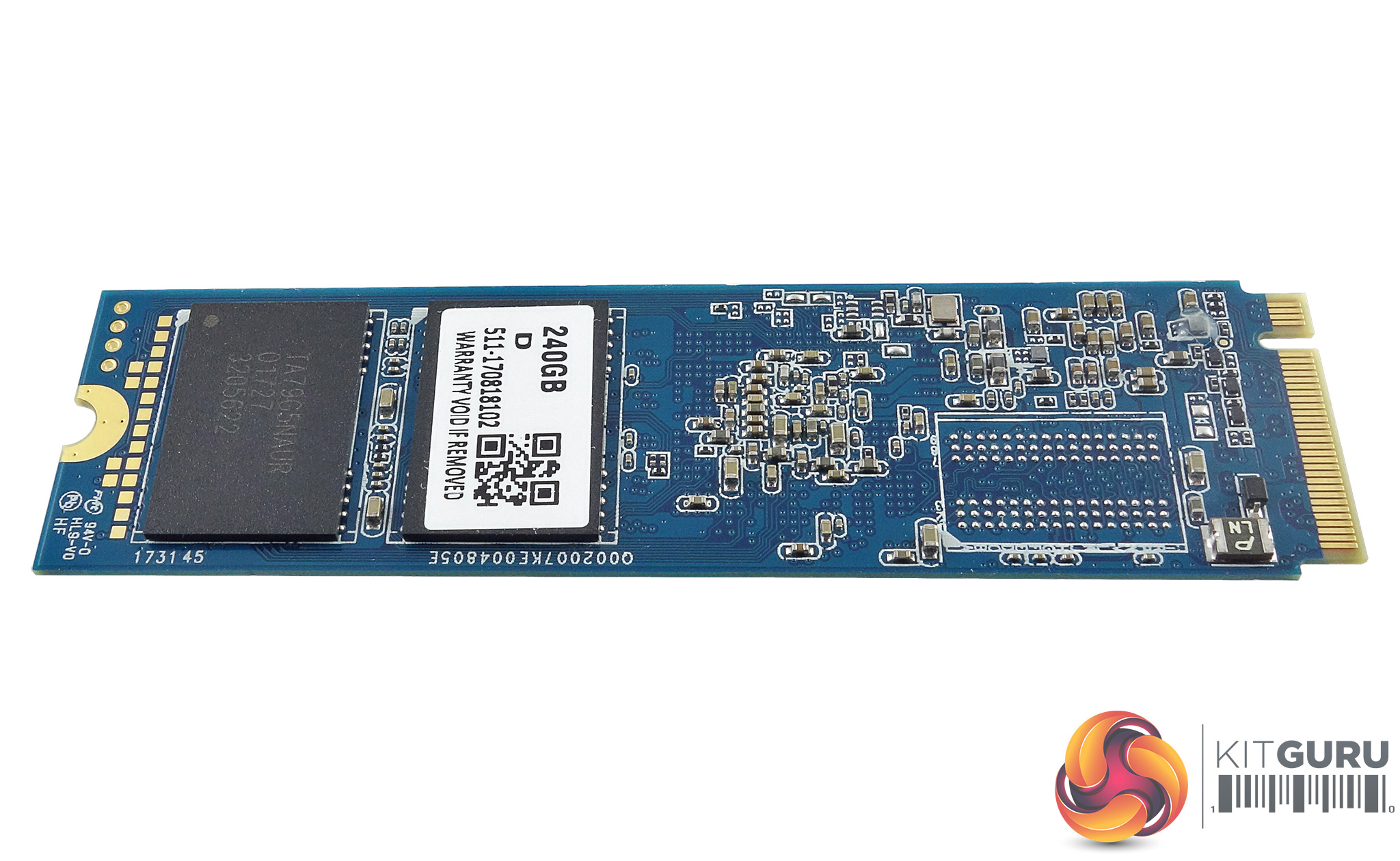 The front side of the PCB has all the components hidden under a sticker. Once removed the main contents of the drive are revealed, there are two Toshiba 15mn 64GB MLC NAND packages (labelled TA79G5NAUR), a Phison PS5007-E7 controller and a 256MB DDR3L-1600 cache IC (Nanya NT5CC128M161P). Another two 64GB NAND packages are housed on the reverse side of the PCB.