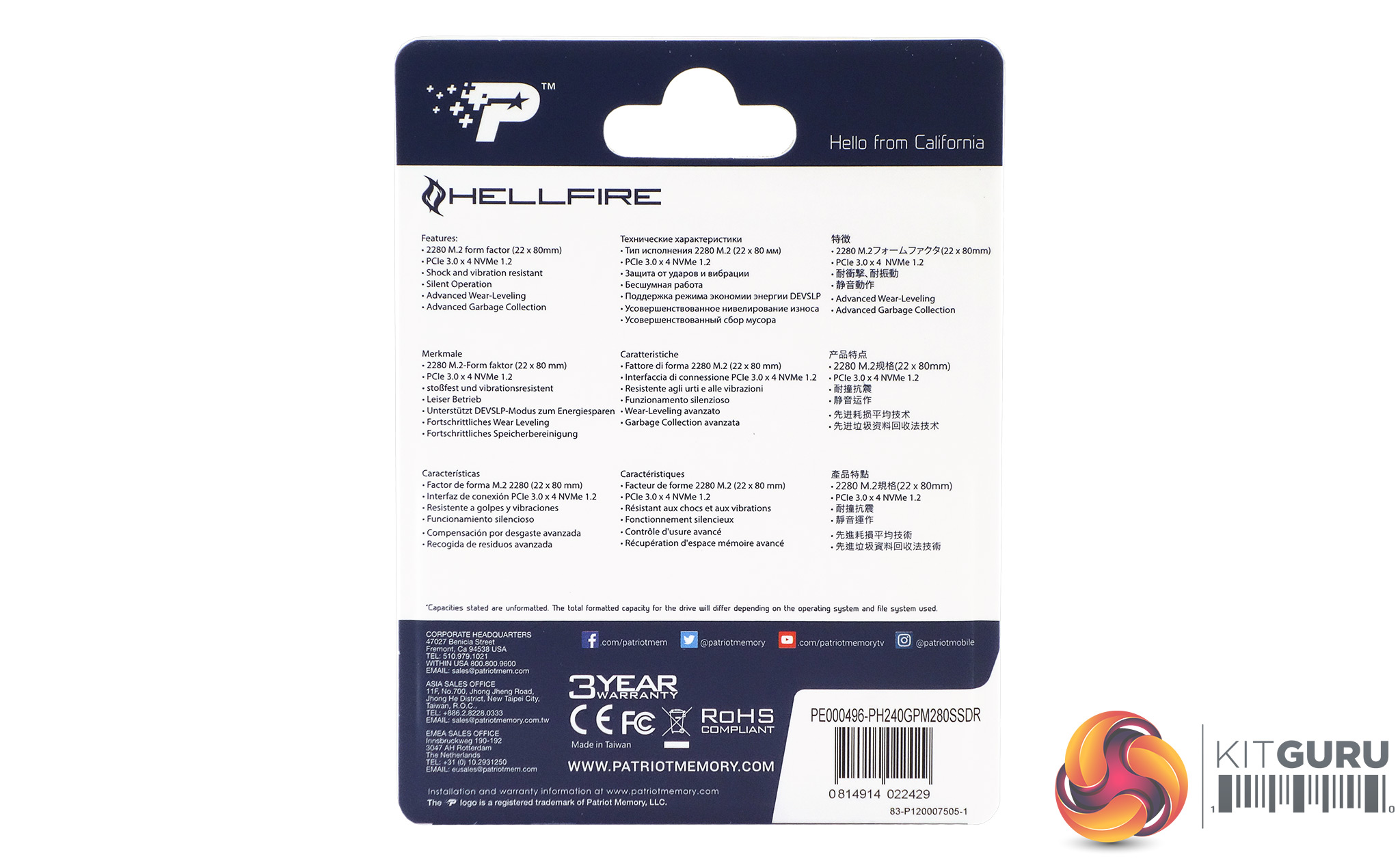 Patriot's Hellfire comes in a simple no frills blister pack with a panel on the front of the pack displaying drive capacity and interface details. The rear of the pack displays brief multilingual descriptions of the drives features.