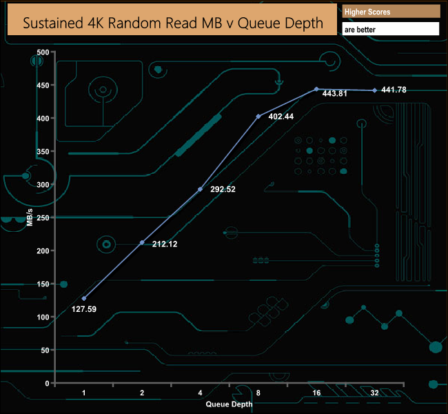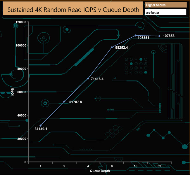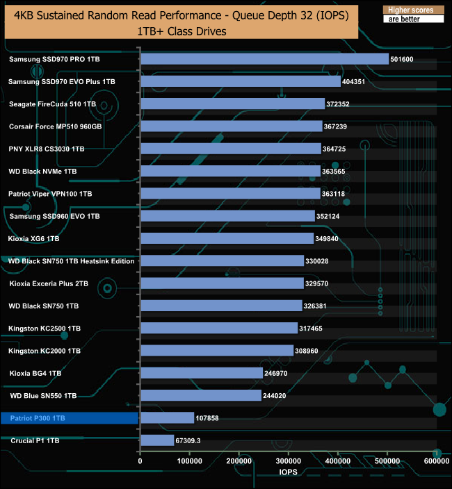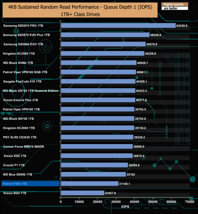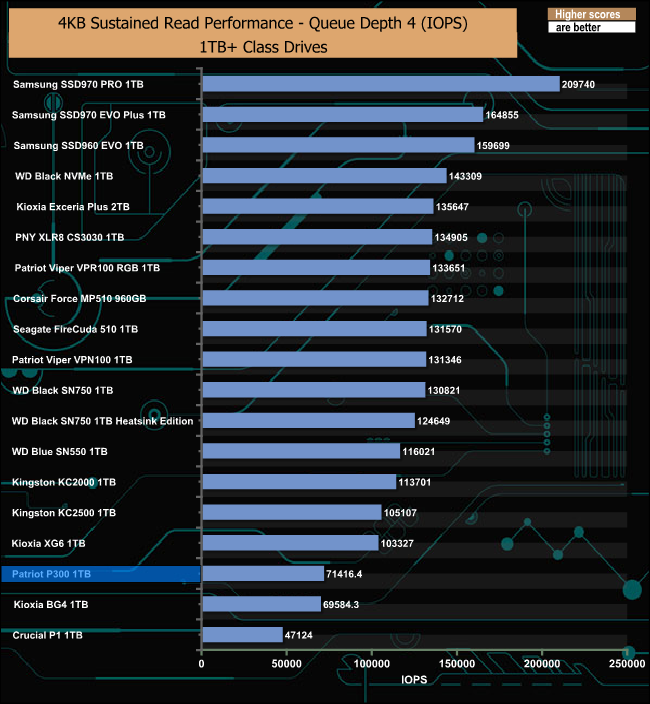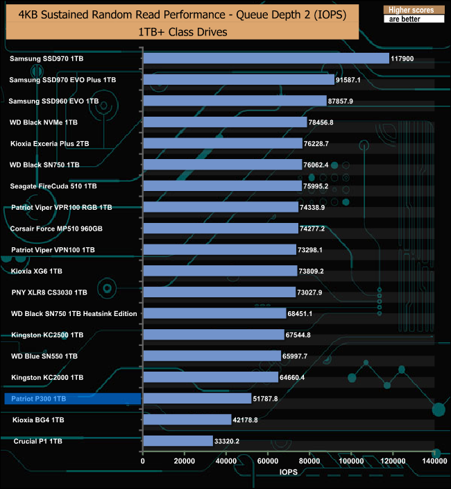 The Patriot P300 didn’t perform too well in our sustained 4K random read test, sitting close to the bottom of our result charts at all the tested queue depths.