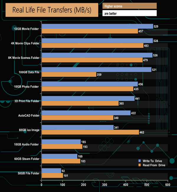 Patriot's PXD is a fast external drive especially dealing with larger file sizes. It took just 2m 52s to transfer the 60GB iso image to the PXD and 2m 7s going back the in the other direction. Even small bity data is dealt with pretty efficiently, with our 60GB Steam folder taking 6m 2s to be copied to the drive and 5m 35s for the return journey.