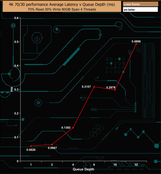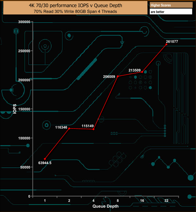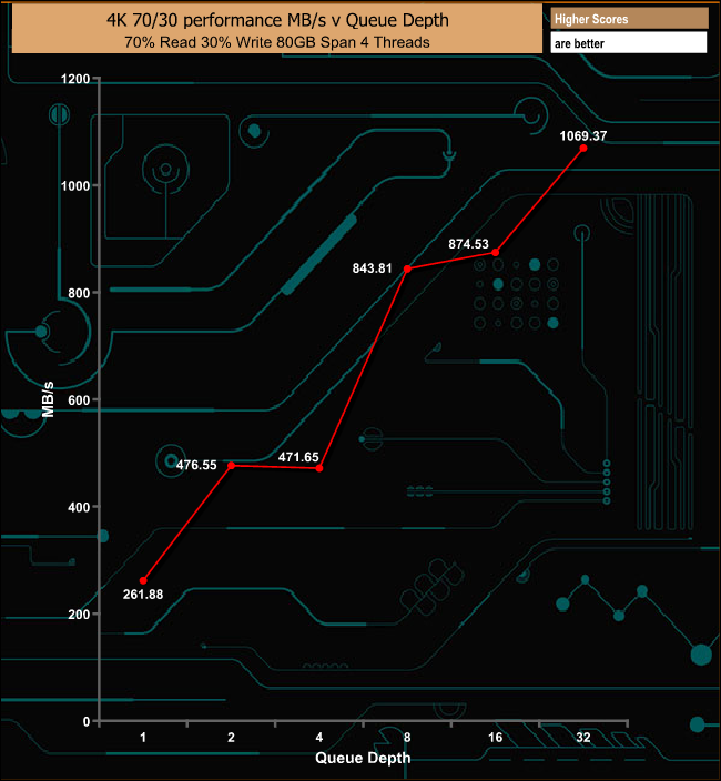 The VP4100 displayed strong performance in the 70/30 read/write mix test. However the drive doesn't climb through the queue depths smoothly as there are two distinct periods when the performance seems to slow down; between QDs 2 and 4 and again at QD 8 to 16.