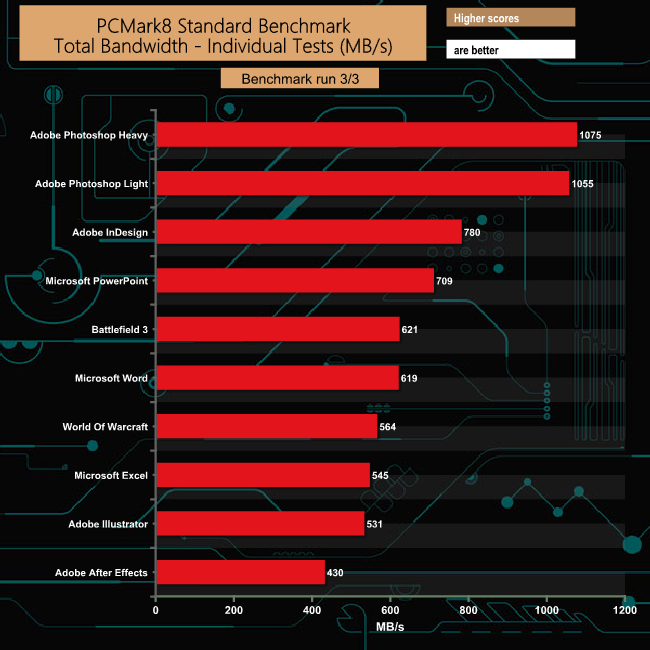 Just like the Consistency test, PCMark 8’s Standard Storage Test also saves a large amount of performance data. The default test runs through the test suite of 10 applications three times. Here we show the total bandwidth performance for each of the individual test suites for the third and final benchmark run.