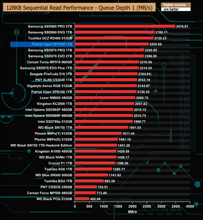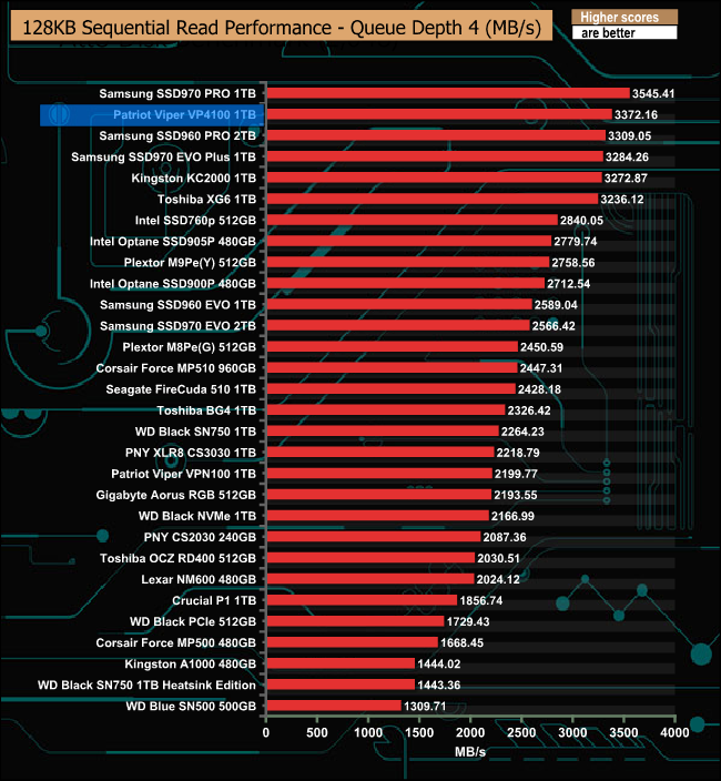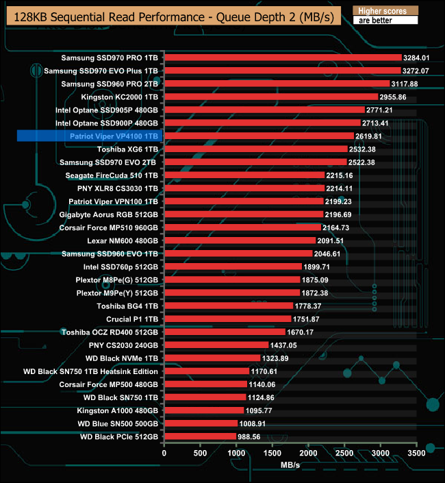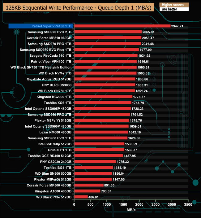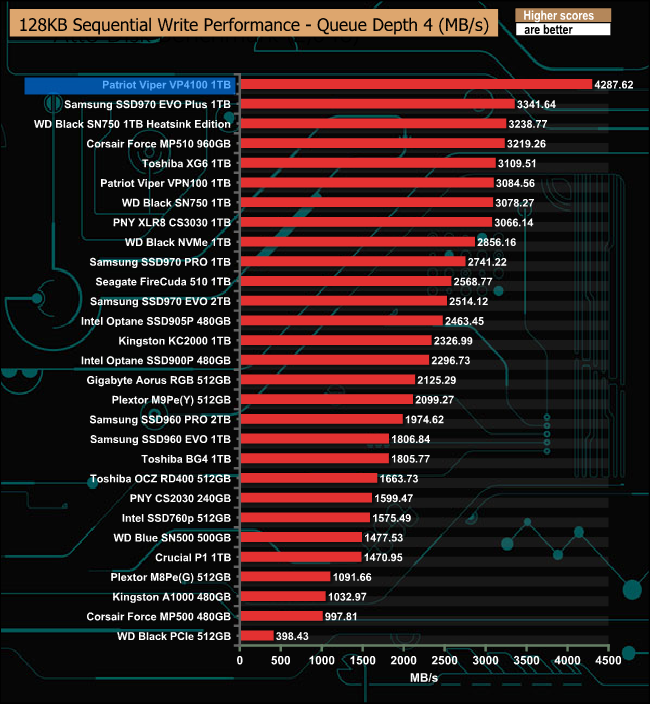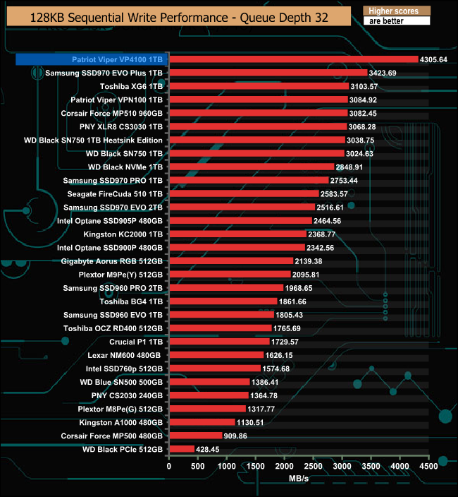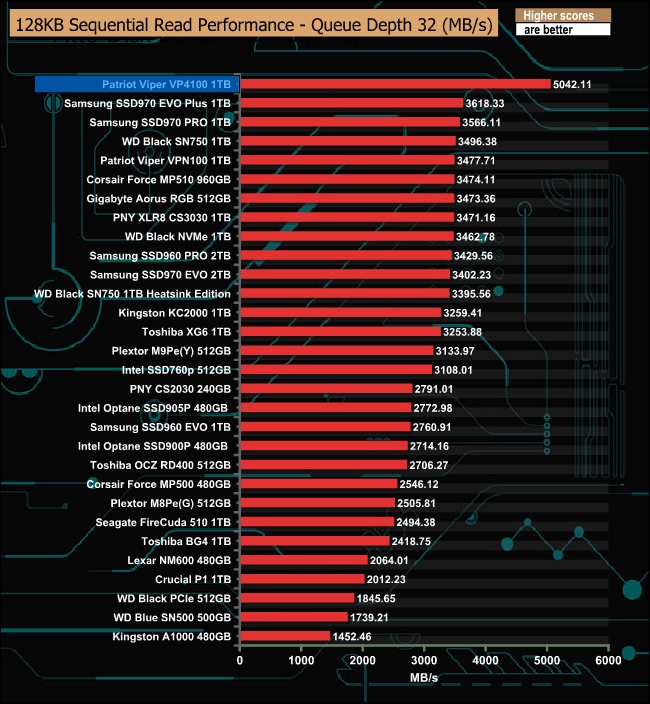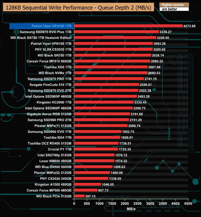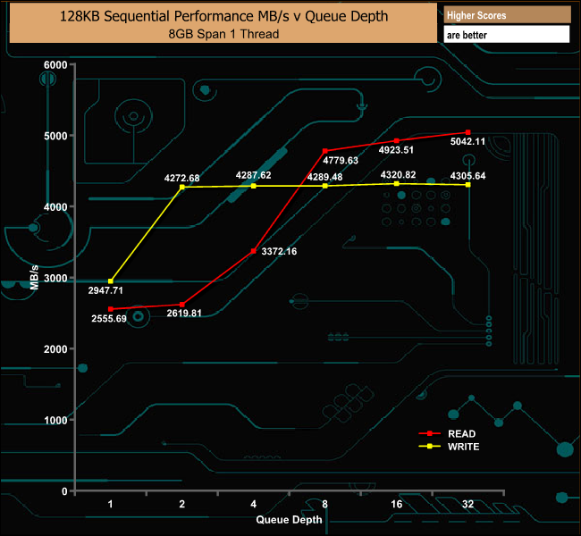 The drive's Sequential read performance improves as the depth deepens, until finally at a QD of 32, the drive tops the 5,000MB/s mark at 5,042MB/s, the fastest read speed for a consumer M.2 drive we've seen to date.