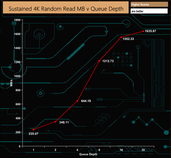 The drive appeared to perform the best in relation to the other drives around it in our results charts at both ends of the spectrum, that's to say queue depths 1 and 32. At other tested QDs, the drive seems to drop back a little.