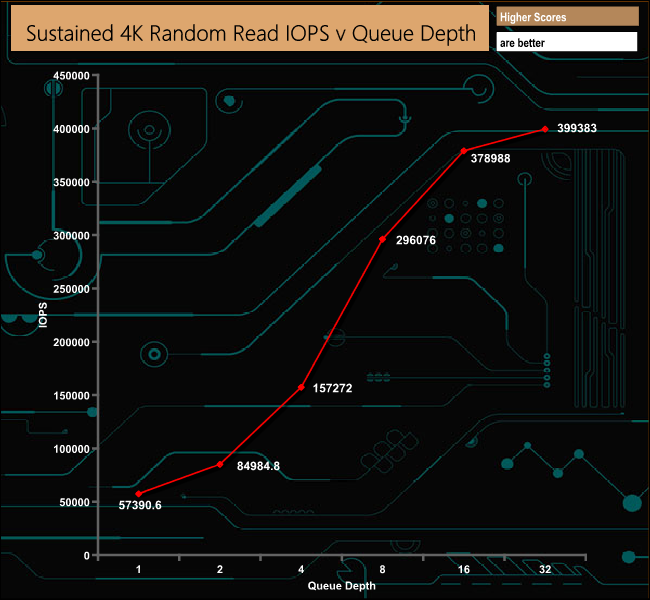 In stark contrast to the official 800,000 IOPS 4K read performance, the fastest figure we saw from the drive in our four threaded tests was 399,383 IOPS.