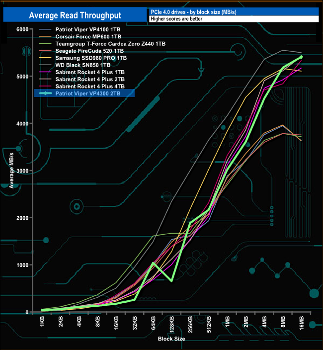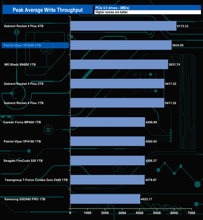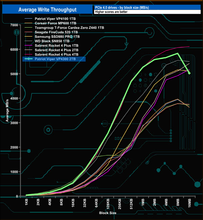 In our write throughput test, the drive peaked at the 8MB block mark at 5,834.85MB/s before slipping back to finish the test run at 5,024.58MB/s. That peak figure is well short of the official maximum of 6,800MB/s but it does make the VP4300 the second-fastest drive we've seen in this test after the 4TB version of Sabrent's Rocket 4 Plus drive.