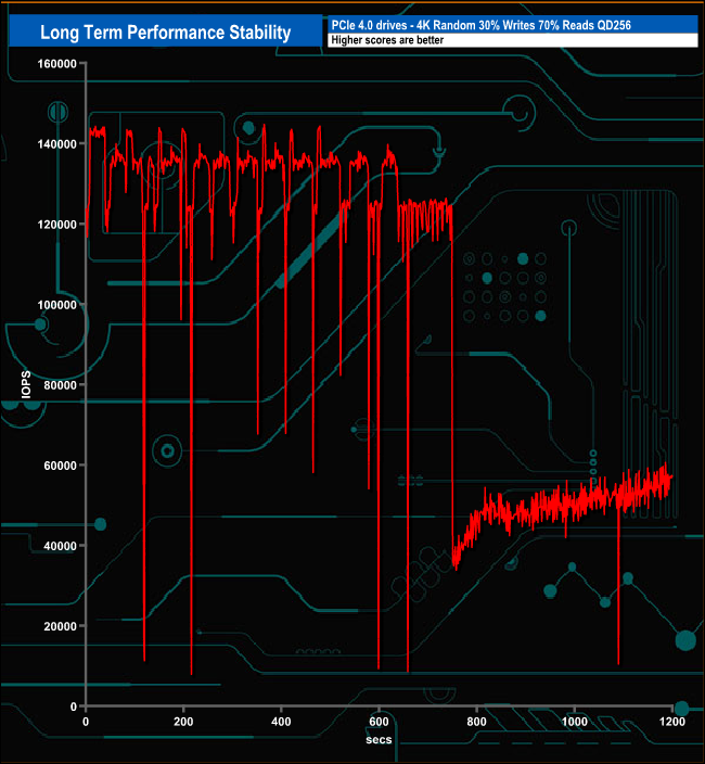 For the long term performance stability test, we set the drive up to run a 20-minute 4K random test with a 30% write, 70% read split, at a Queue Depth of 256 over the entire disk. The 2TB Patriot Viper VP4300 averaged 99,966 IOPS for the test with a performance stability of 69%