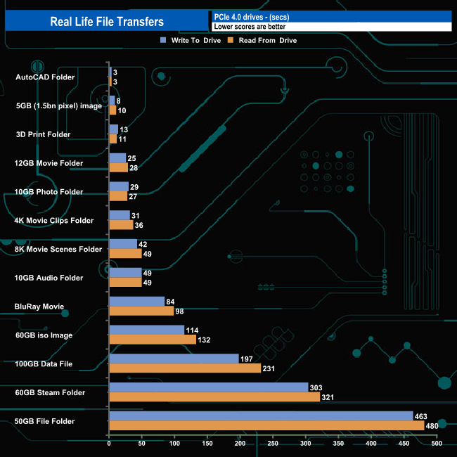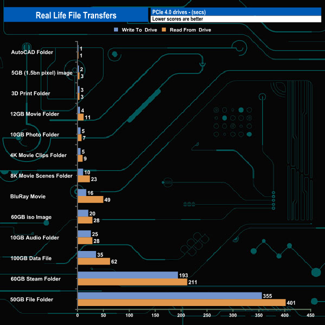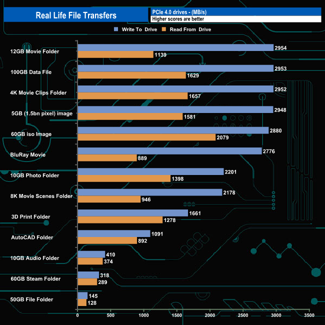 Switching over to an all NVMe storage environment saw transfer speeds for the large file transfers rocket and times taken drop dramatically with the Viper VP4300. Six of the transfers topped well over 2.5GB/s for writing to the drive with four just a shade under 3GB/s.