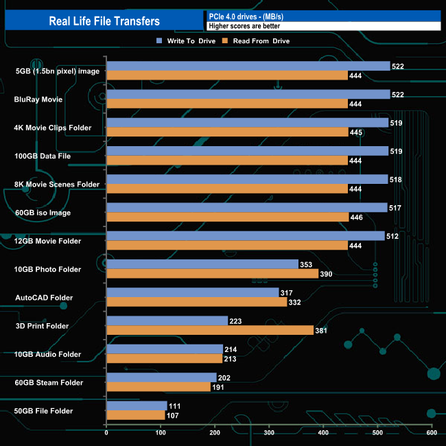 The Patriot Viper VP4300 dealt with our real-life file transfers without any problems, showing very good consistency of performance for both reads and writes when dealing with the larger file sizes, averaging 518MB/s when writing to the drive and 444MB/s when reading the data back. As usual, it’s the small files in the Audio, Steam and File folders that cause the drive to slow down.
