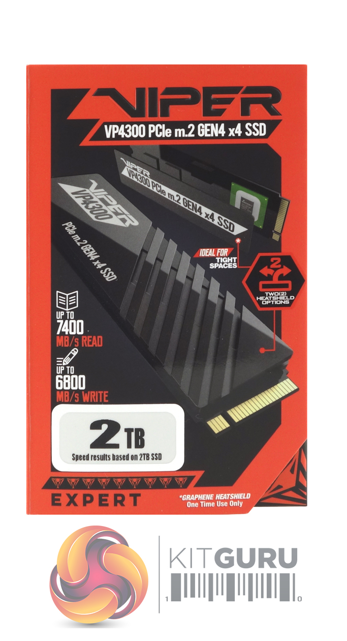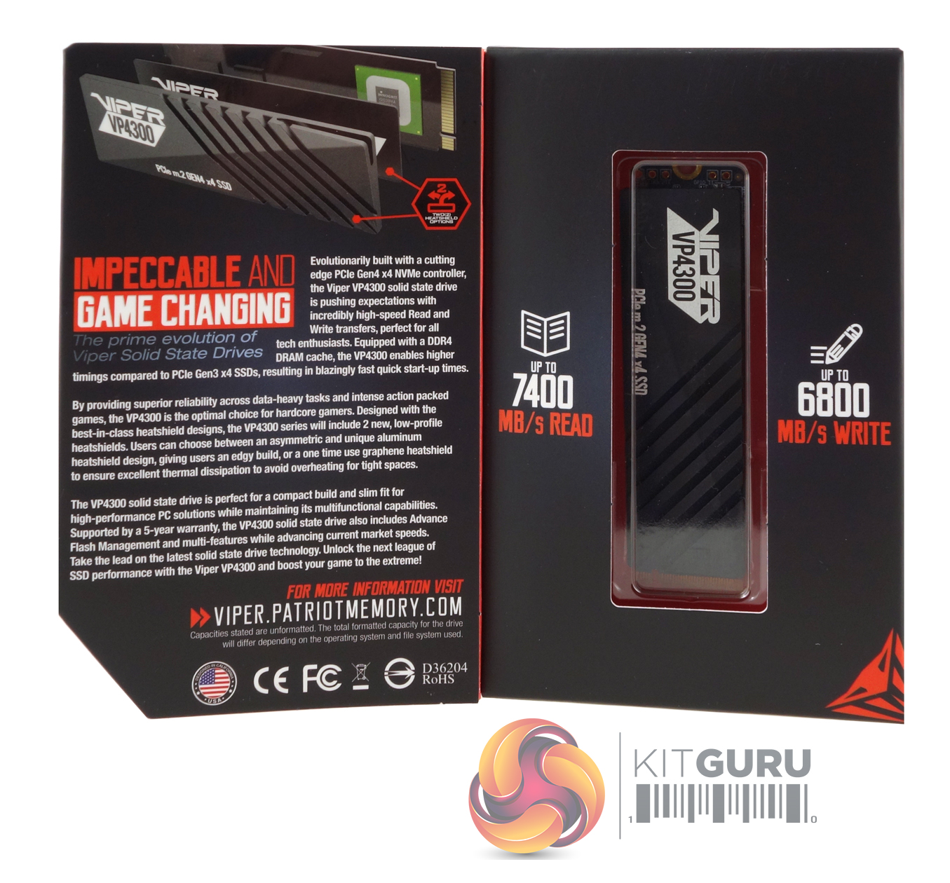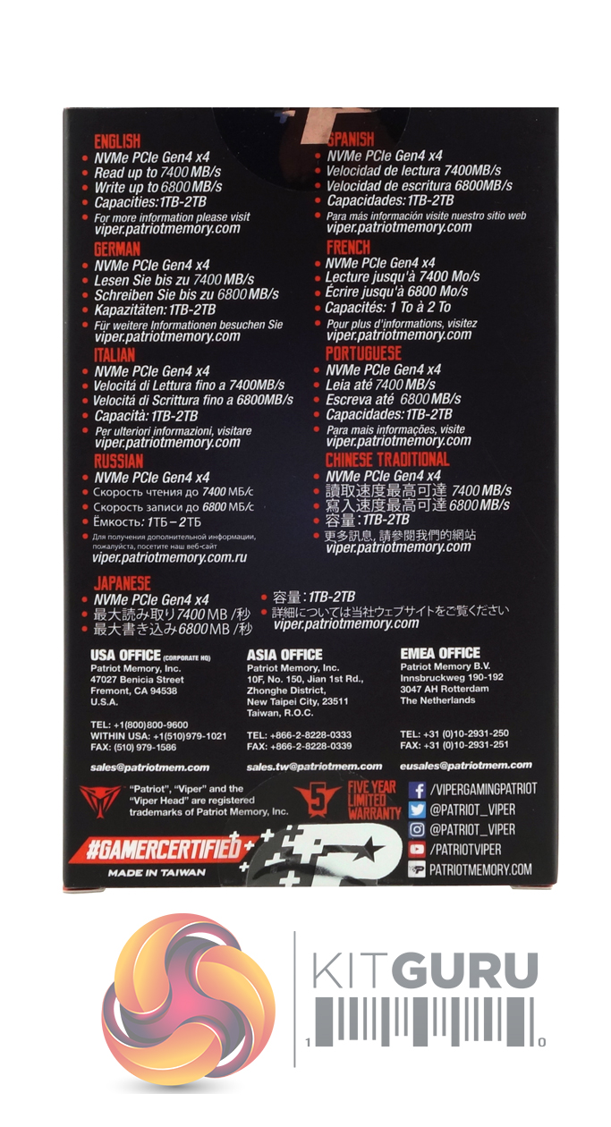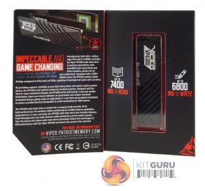 The drive comes in a stout, compact box finished in matt red and black, with a large image of the drive on the front along with the two heatsinks that come with the drive. Below the image are the Sequential speed figures for the drive: up to 7,400MB/s reads and up to 6,800MB/s for writes. Under these figures is a sticker displaying the drive’s capacity. The rear of the box is covered by multilingual lists, highlighting a few of the drive’s specifications.