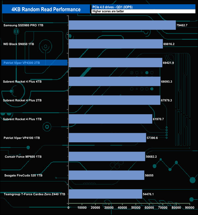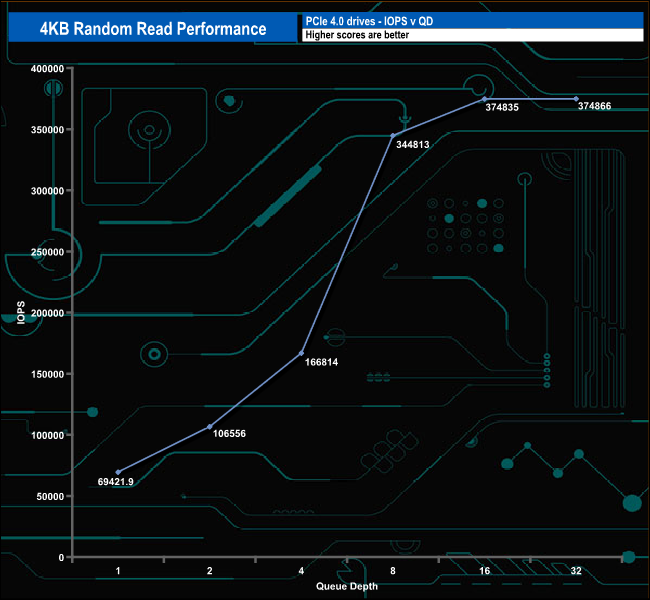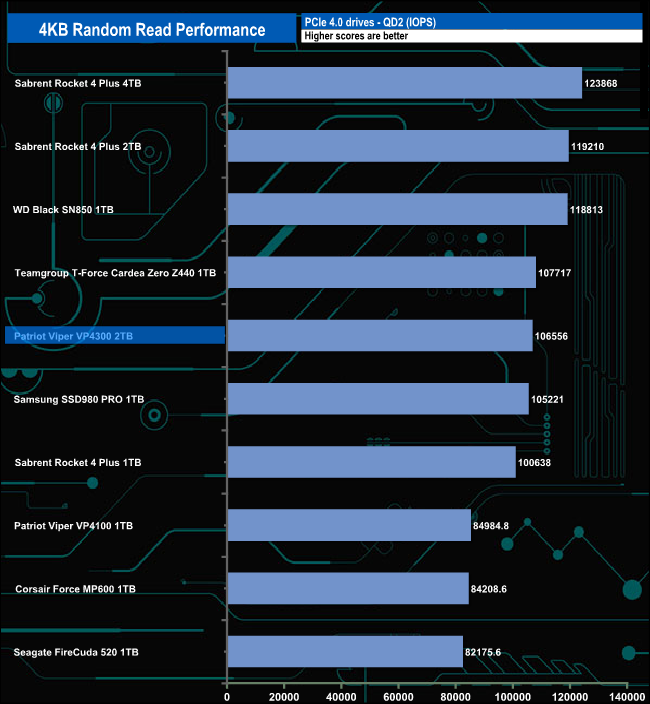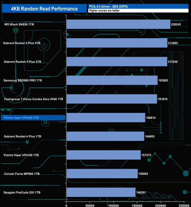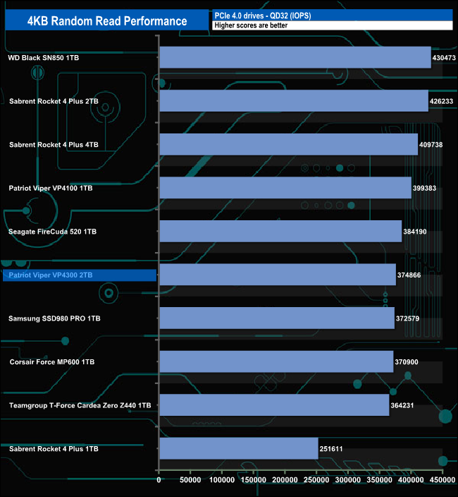 Patriot rate the Viper VP4300's 4K random read performance as up to 800,000 IOPS. With our 4-threaded tests, we couldn't get close to that figure, the best we saw was 378,835 IOPS (QD16). We did run a quick test at QD32 using 8 threads and got a result of 465,446.8 IOPS, much improved but still way off that maximum figure.