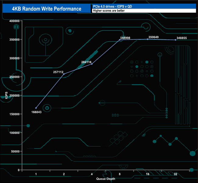 The official Viper VP4300 random write performance is rated the same as the random read's, 800,000 IOPS. As with our random read tests, we couldn't get close to that figure, the best we saw was 350,649 IOPS (QD16). Once again we did a quick test at QD32 using 8 threads and got a result of 536,228.1 IOPS.