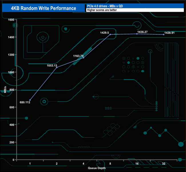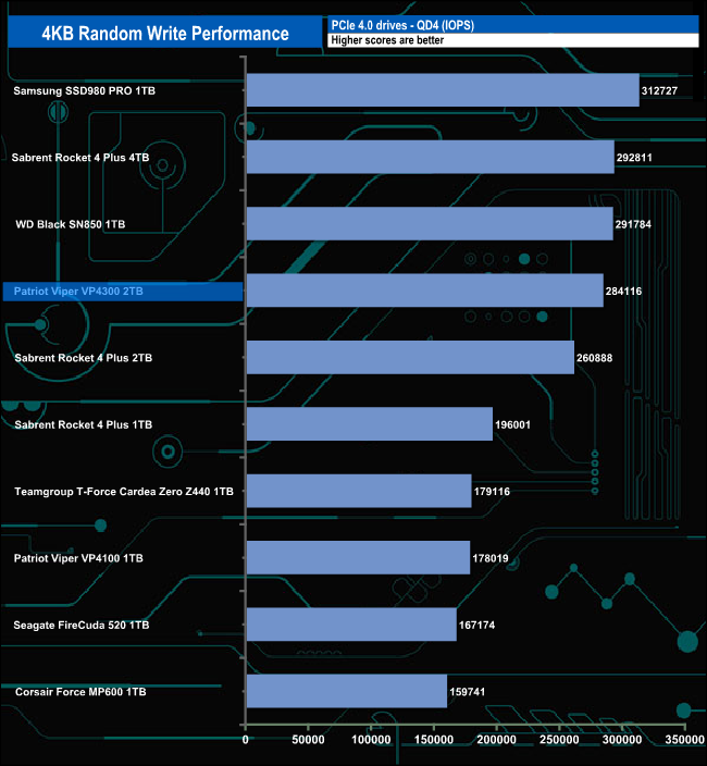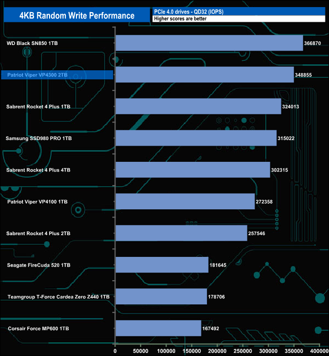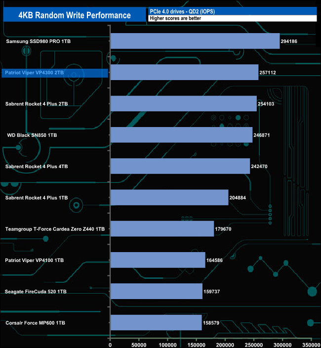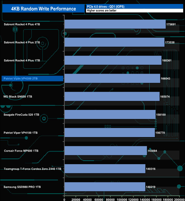In comparison with other Gen4 drives we've tested, the Viper VP4300 performs the best at QDs 2 (where only Samsung's SSD980 PRO beats it) and 32 where it lies in second place on our results chart, behind the WD Black SN850.