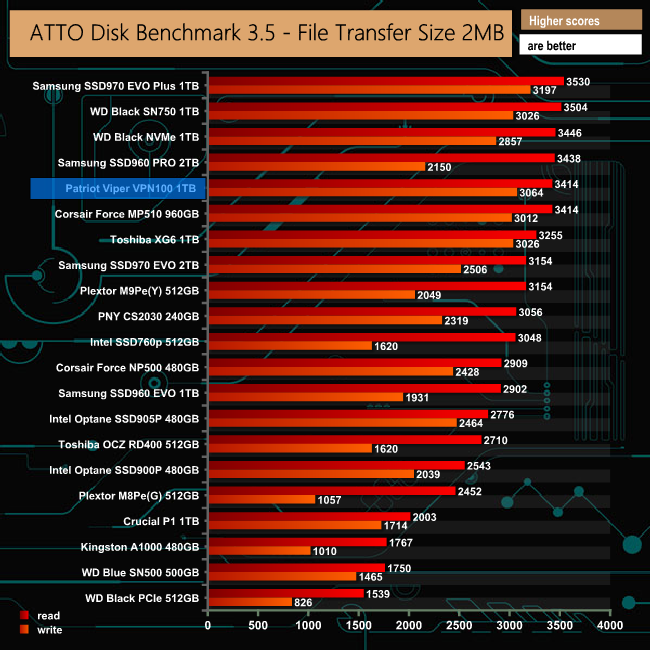 Patriot quotes Sequential performance figures for the 1TB VPN100 as up to 3,450MB/s for reads and up to 3,000MB/s for writes. Using the ATTO benchmark we could confirm both figures, with the review drive producing a read score of 3,414MB/s and 3,064MB/s for writes.