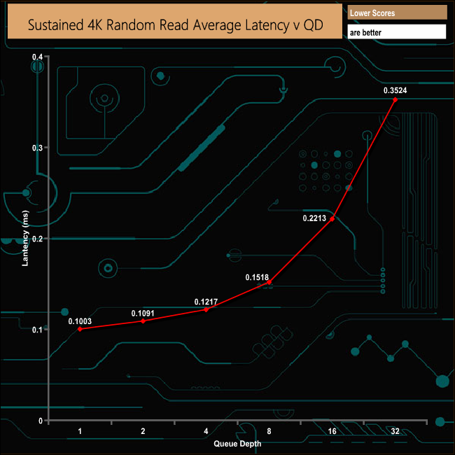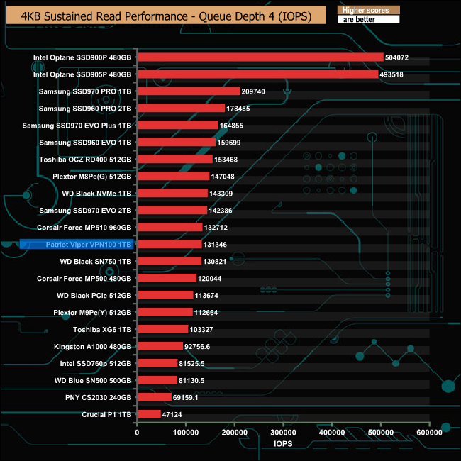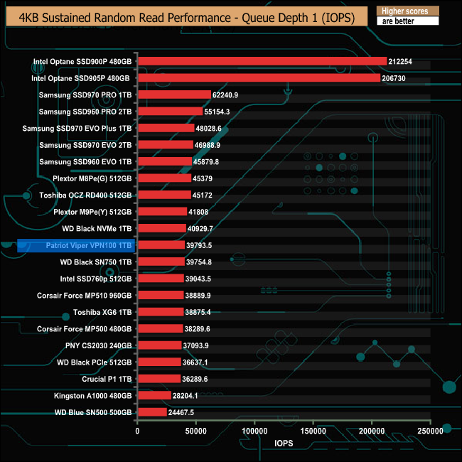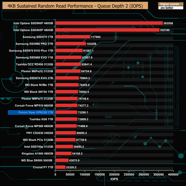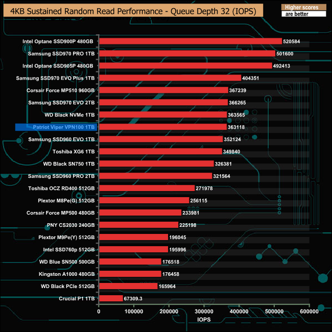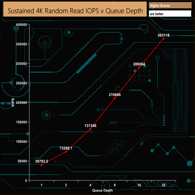 The Patriot Viper VPN100 produced a very consistent performance curve in our 4K random read test, topping out at 363,188 IOPS at a queue depth of 32.