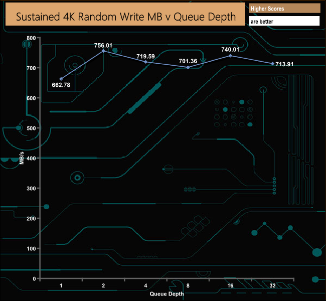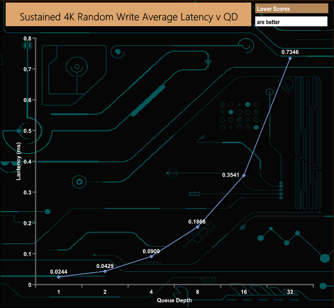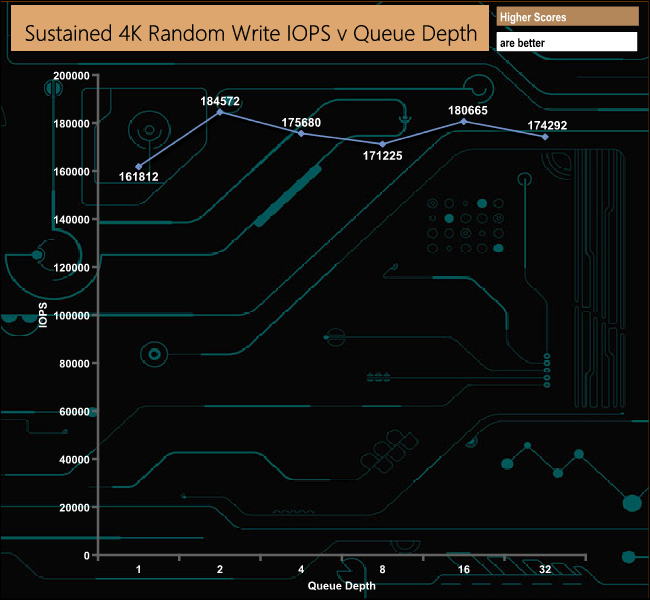 As with the random read performance, we couldn't get close to the maximum write IOPS figure of 650,000 IOPS with our 4 threaded write tests, the fastest we saw was 184,572 IOPS at QD2. The fastest write IOPS figure we saw from the drive during testing was the 622,990 IOPS (QD32 16 threads) result from the CrystalDiskMark 7 Peak Performance profile test, but even this figure is short of the official maximum of 650,000 IOPS.