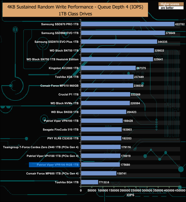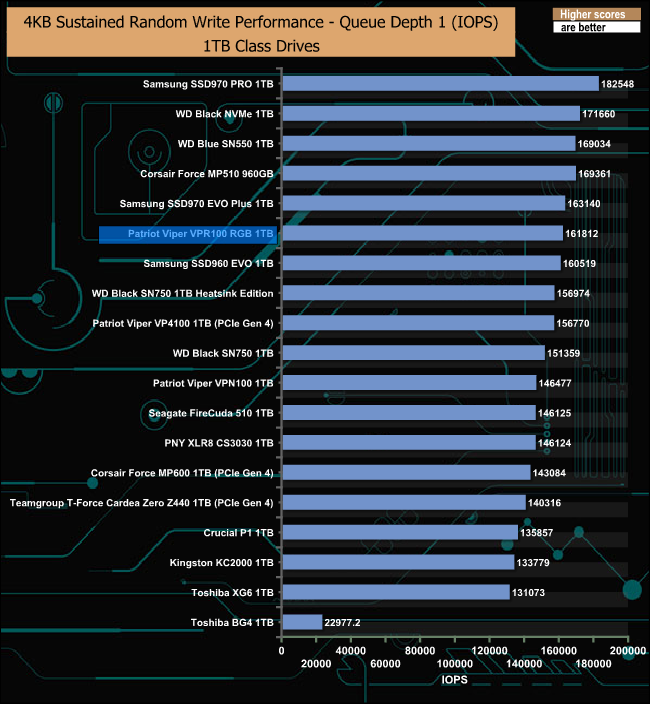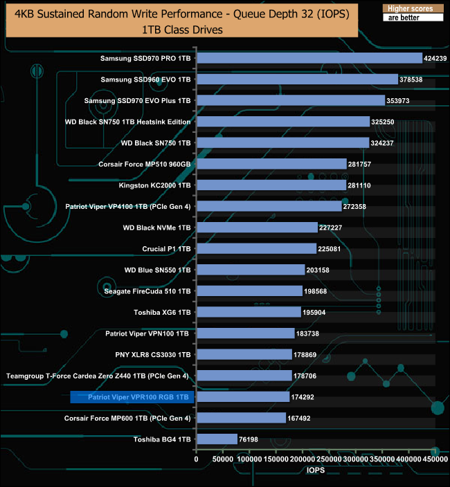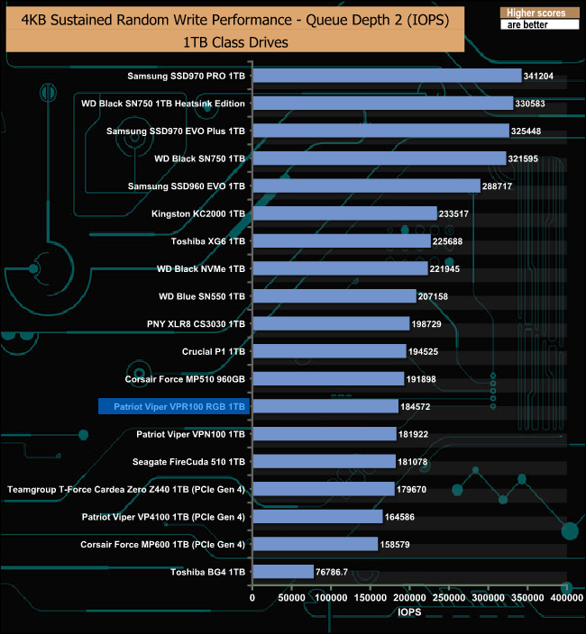 At QDs 1 and 2, the Viper VPR100 holds the advantage over the Viper VPN100 in our random write test, but at QDs 4 and 32 the positions change and it's the VPN100 that holds the advantage.