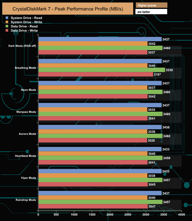 Now back to that “RGB sync may decrease up to 20-30% Read/Write speed” quote in the spec sheet. We tested the drive (both as a Windows 10 system disk and as a secondary data disk) in all eight integrated modes with Crystal Disk Mark 7's Peak Performance test to push the drive hard, and saw hardly any movement in the Sequential read/write figures.