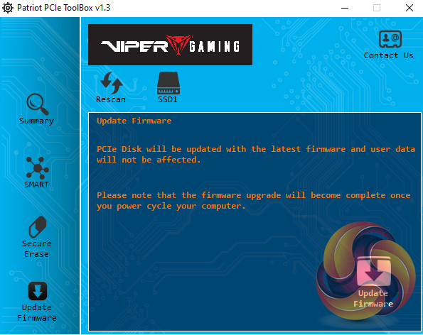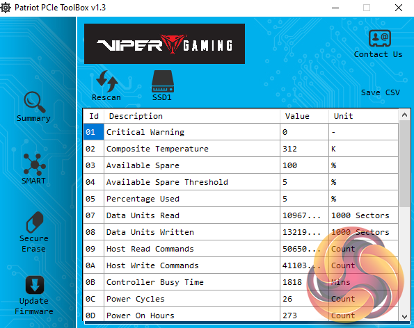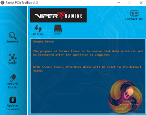 Patriot’s SSD management software, the Patriot PCIe Tool Box (v1.3) looks a pretty basic utility compared to some of its competitor's offerings but it really does offer all you really need to keep an eye on your drive. It shows information on the firmware version, serial number, total capacity, endurance, power-on time, if TRIM is enabled, and SMART data. It also allows the secure erase of the drive and the updating of the firmware.