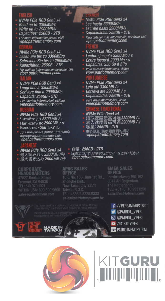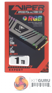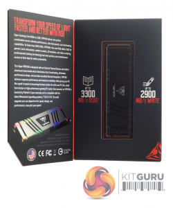 The VPR100 RGB comes in a compact, well-constructed box. On the front is an image of the drive along with Sequential read and write figures, as well as a sticker showing which capacity drive is in the box. Above the image is a brief description of the RGB technology supported by the VPR100.