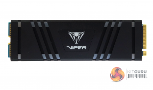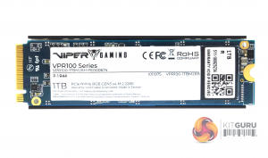 The VPR100 RGB 1TB drive is a dual-sided design. The front of the drive is covered by an impressive looking, large passive, RGB equipped heatsink. As well as the heatsink Patriot has fitted an external sensor as well, to allow the drive to perform at its best. Sitting under the heatsink is the Phison PS5012-E12 controller along with two 256GB packages of Toshiba 3D TLC NAND (labelled TABBG55AIV) and a 512GB SK hynix H5AN4G8NBJA DDR4 DRAM cache IC.