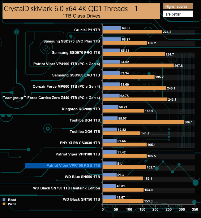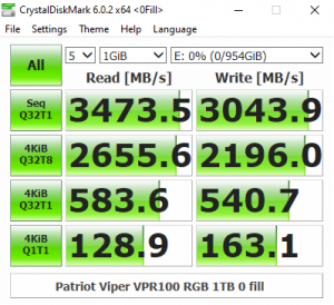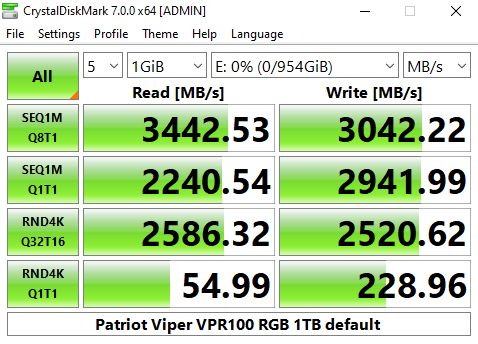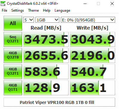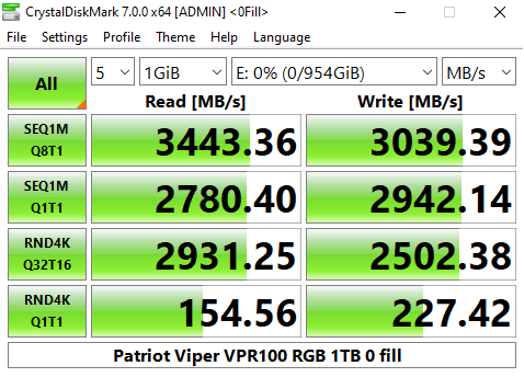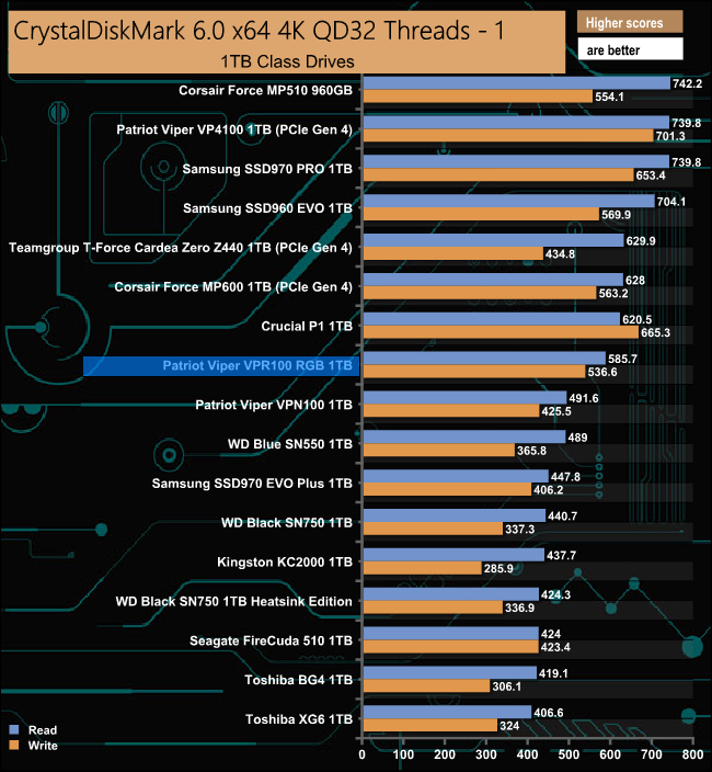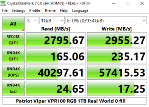 In the CrystalDiskMark 6 QD32 test, the Viper VPR100 shows an improvement in both read and write performance over the VPN100 drive. As the both drives use the same controller/NAND combination it's probably down to tweaks in the later version of the firmware that the VPR100 uses.