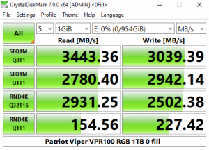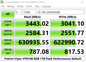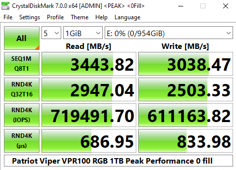 Looking at the Peak Performance results for Sequential read/write performance we see that the review drive couldn't get to the maximum official quoted CrystalDiskMark score of 3,900MB/s, with a read figure of 3,443MB/s. However, the write figure of 3,038MB/s was faster than the official 2,900MB/s.