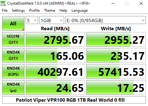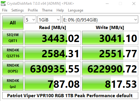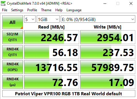 The latest version of CrystalDiskMark, version 7, includes a couple of profiles that can be used for testing – Peak Performance and Real World. The result screens for these two profiles not only display MB/s results but also IOPS and latency.