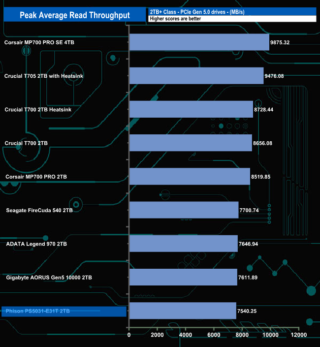 In our read-throughput test, the drive peaked at the 16MB block mark at 7,540.25MB/s, nowhere near the official maximum figure of 10,300MB/s. One thing to notice is that the performance curve of the E31T is so much smoother than any other Gen 5 drive tested here.