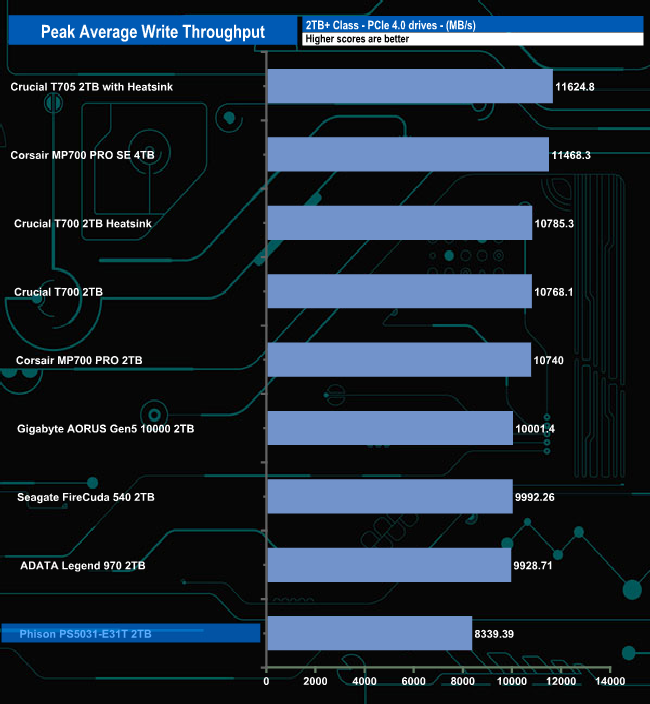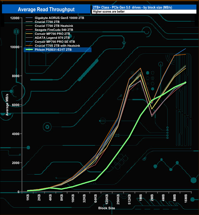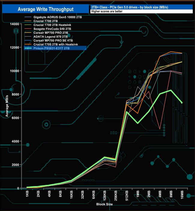 Although the E31T throughput test result is nowhere near the official rating, it does keep it in touch with the majority of the 10GB/s drives on this list.