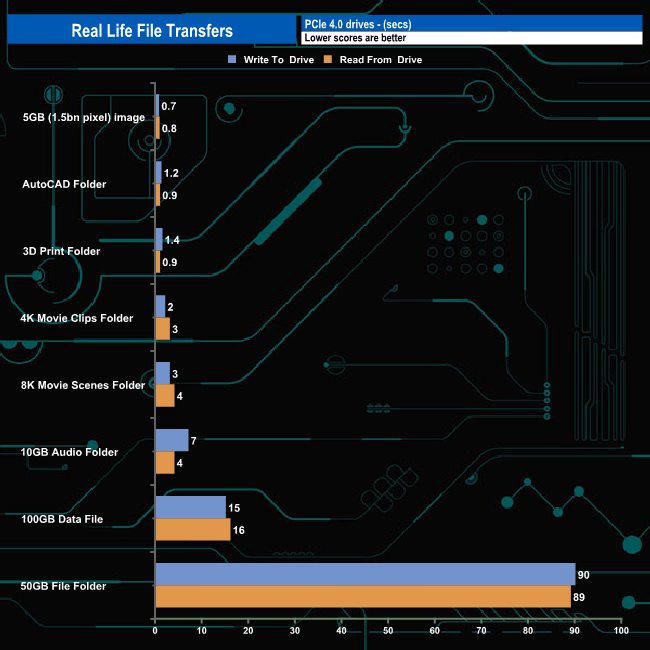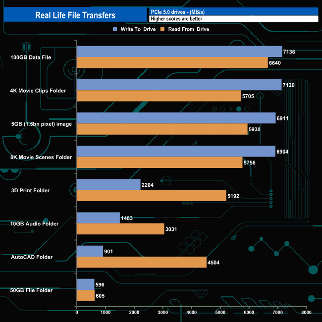 The PS5031-E31T averaged 4,156MB/s when writing the 8 transfer tests, with the fastest being 7,136MB/s for the 100GB Data file transfer and the slowest being the 50GB file folder transfer at 596MB/s. Reading back the data the average was 4,670MB/s. Once again the fastest transfer was the 100GB Data file at 6,640MB/s while the slowest was the 50GB file folder at 605MB/s.