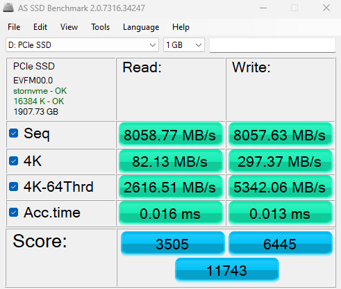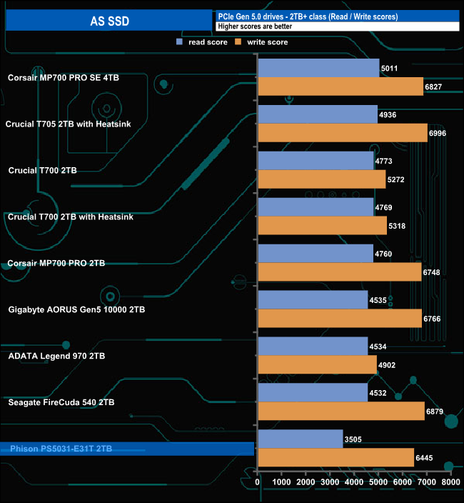 The E31T sits at the bottom of the ASSSD results chart thanks to its read score of 3505. Its write score of 6445 is much more competitive.