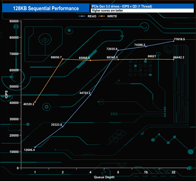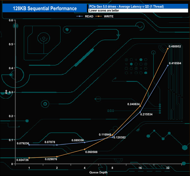 At QDs 1, 2 and 4 the drive sits on the bottom of the results charts a fair way off from the other Gen 5 drives. However, at QD32 the drive climbs up the table to lead the way for the 10GB/s drives.