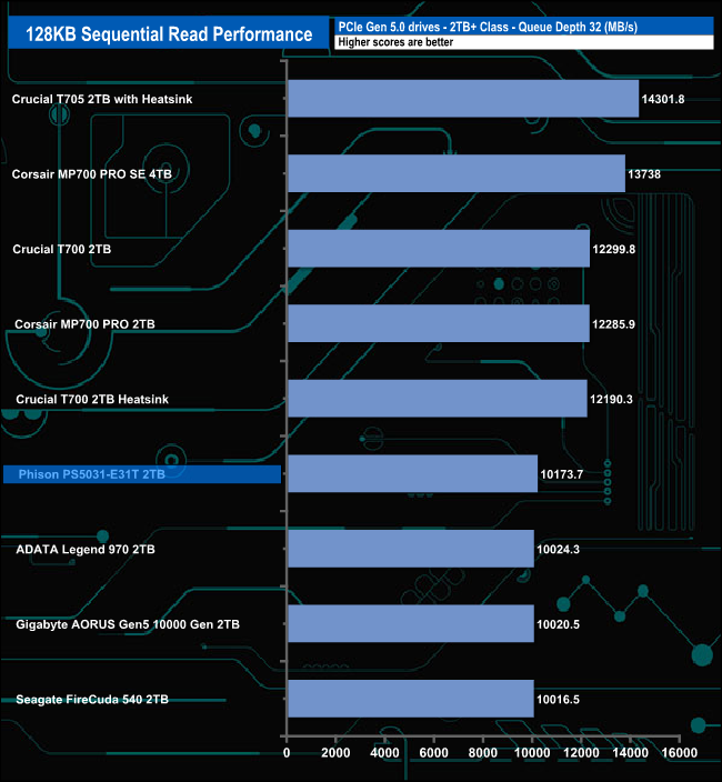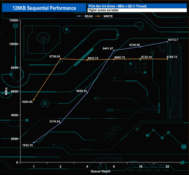 In this test we couldn't quite confirm the official maximum Sequential performance figures for the PS5031-E31T of 10,300MB/s for reads with a test result of 10,173.7MB/s. However, we could confirm and even better a little the official 8,600MB/s rating with a result of 8,732.14MB/s (QD16).