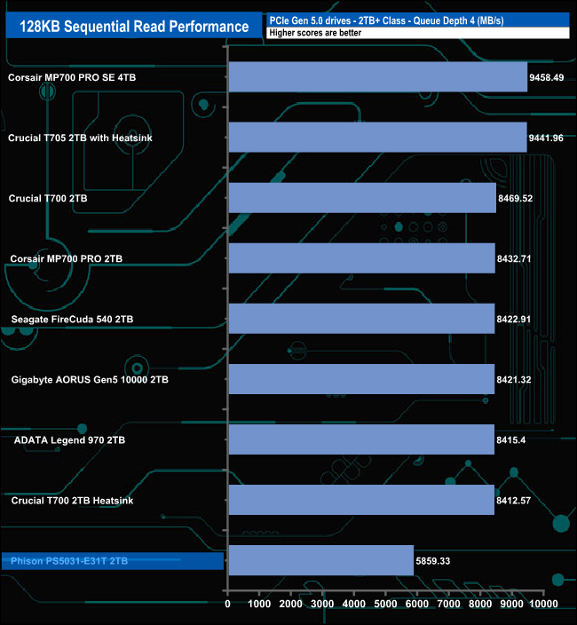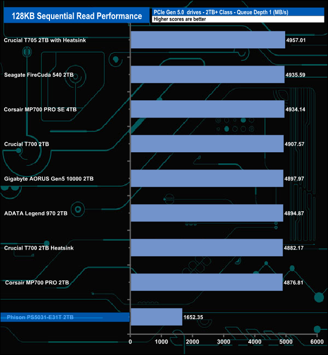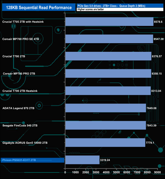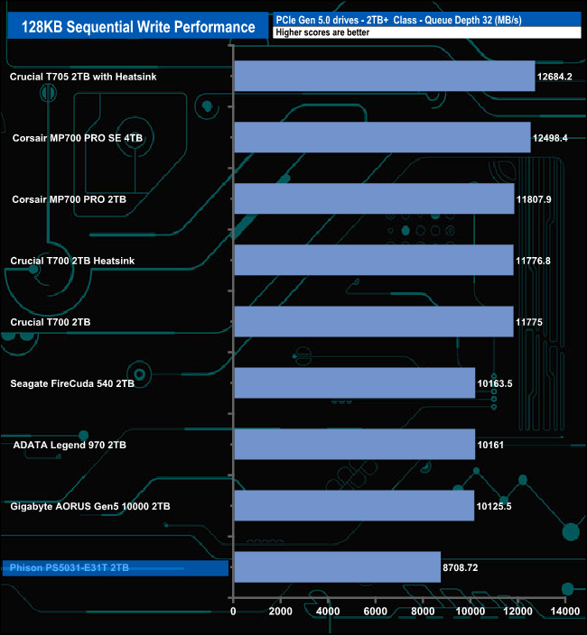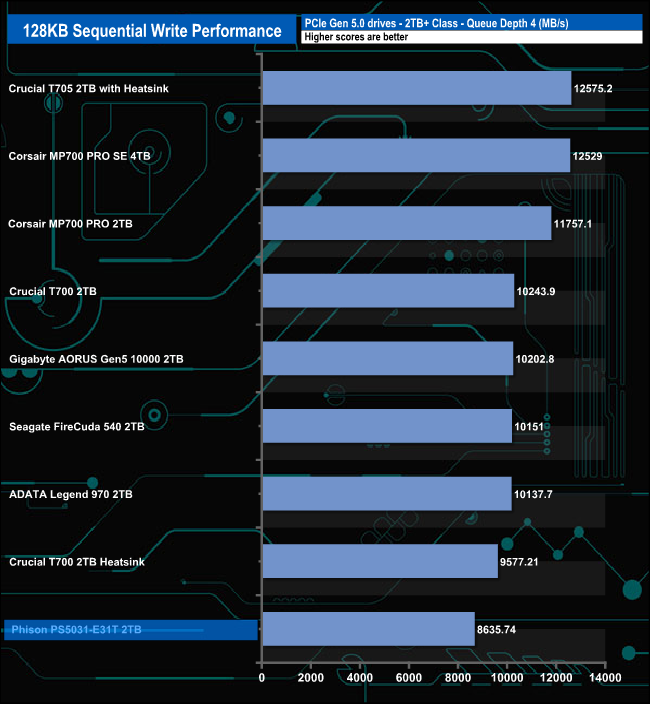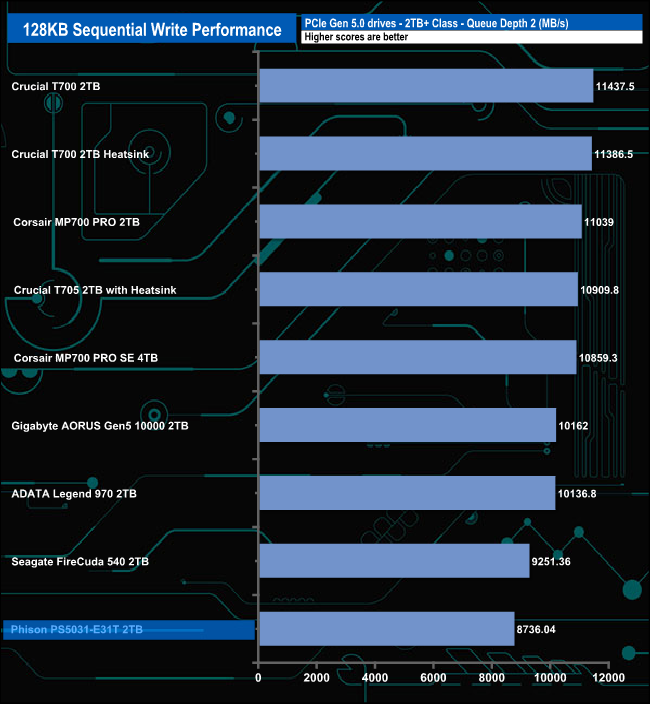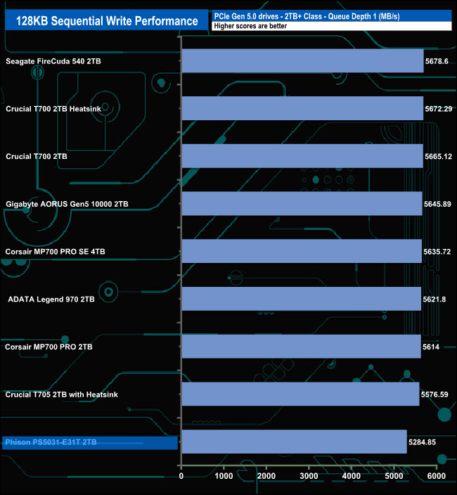 When it comes to the Sequential write test results the PS5031-E31T sits in the last spot on the results chart through all the tested queue depths.