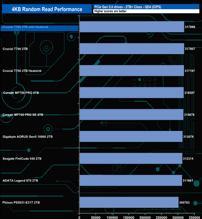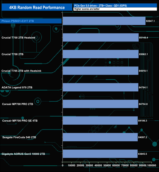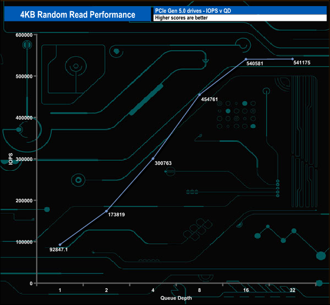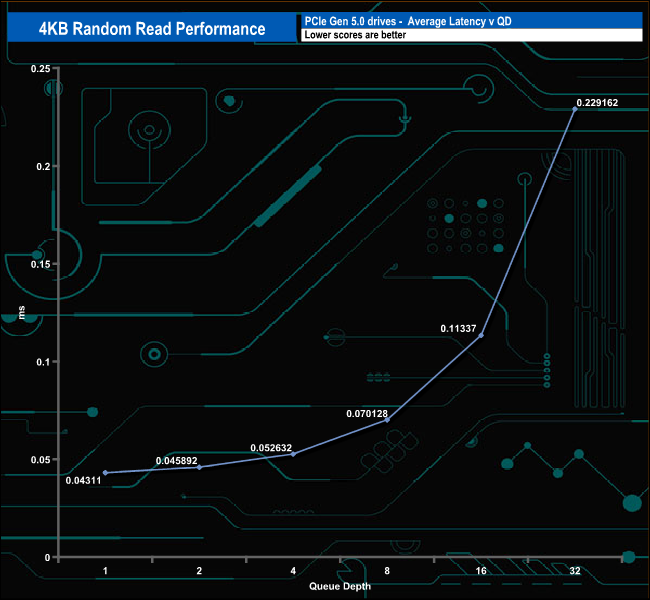 We may not have got close to the maximum official random read figure with our testing but that doesn't stop the PS5031-E31T from being the fastest Gen 5 drive we've seen to date in this test, as It tops the charts at all the tested queue depths. But the QD1 result is particularly impressive, even more so when you realise this is a controller aimed at the mainstream market and not a high-end offering like the drives it's up against in this table.