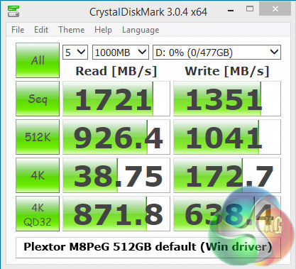“AS SSD is another test where the M8Pe(G) scores highly. It’s interesting to contrast the drive with the last PCIe interfaced Plextor drive we looked at – the M6e Black Edition. It’s a sign of how far SSD technology has progressed in the year since the M6e was launched that its performance is totally eclipsed by the M8Pe(G).”