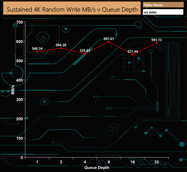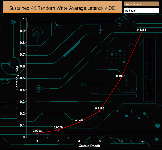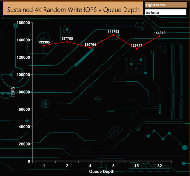 Random 4K write performance shows a couple of dips in performance as the queue depth deepens, first at a QD of 4 and then again at a QD of 16. On both occasions the drive recovers, to finish the test run at 144,319 IOPS at the QD32 mark.
