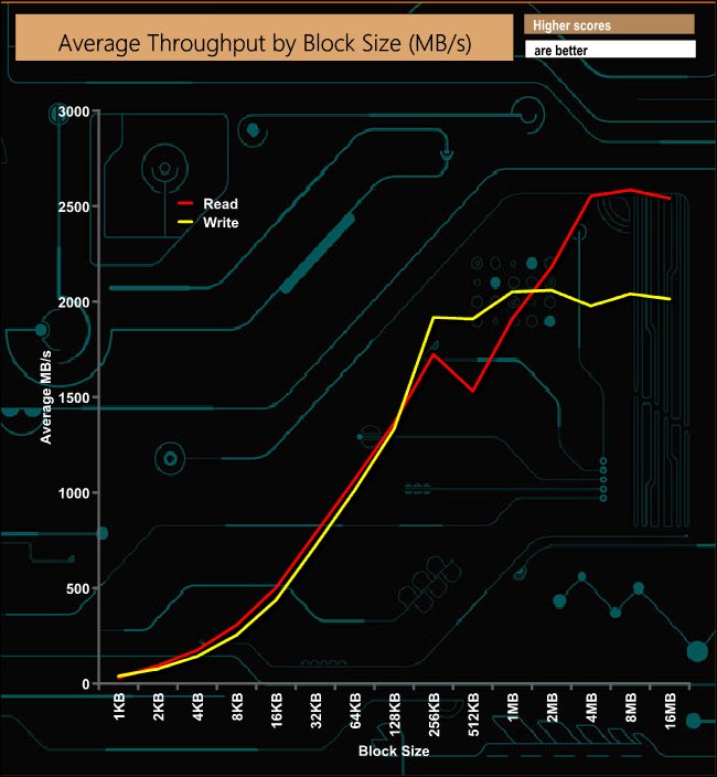 In our throughput test, there was a drop in read performance between the 256KB and 512KB block size but the drive recovered very quickly to peak at 2,584.02MB/s at the 8MB block size. Write performance peaks at the 2MB block size at 2,059.08MB/s before dropping back to finish the test at 2,013.73MB/s.
